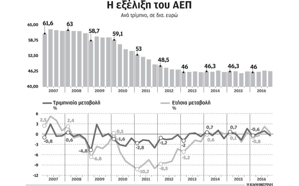 Παρά το συνολικά θετικό πρόσημο στο ΑΕΠ του 2016, εξάλλου, κατά το τέταρτο τρίμηνο χτύπησε ένα προειδοποιητικό καμπανάκι, καθώς το ΑΕΠ σημείωσε υποχώρηση έναντι του αμέσως προηγούμενου τριμήνου κατά 0,4%, πιθανώς επειδή και πάλι άρχισε να διαμορφώνεται κλίμα ανασφάλειας, λόγω της διαφαινόμενης καθυστέρησης στην αξιολόγηση. Σε σύγκριση με το αντίστοιχο τρίμηνο του προηγούμενου έτους, πάντως, σημείωσε αύξηση κατά 0,3%.