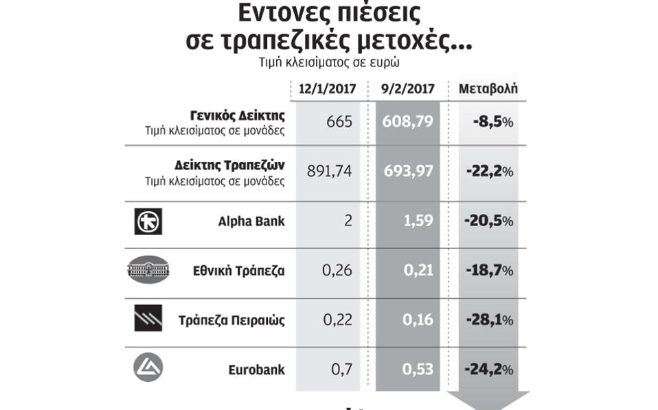 Η επιδείνωση του κλίματος έχει αποτυπωθεί, όπως είναι φυσικό, στις αποτιμήσεις των μετοχών και των ομολόγων. Η απόδοση του διετούς ομολόγου του ελληνικού Δημοσίου ξεπέρασε και πάλι το όριο του 10%, ενώ η απόδοση του 10ετούς ομολόγου ανήλθε στο 7,86% από 6,88% που ήταν ένα μήνα πριν (12 Ιανουαρίου). Στο ίδιο διάστημα, ο Γενικός Δείκτης του Χρηματιστηρίου Αθηνών καταγράφει απώλειες 8,5%, ενώ ο δείκτης των τραπεζών σημειώνει «βουτιά» άνω του 22%.