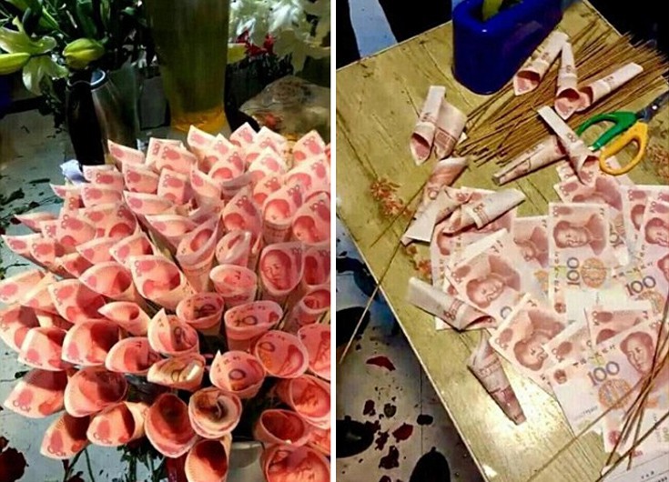 Τα λουλούδια στο μπουκέτο των πολύ λεφτών αισθημάτων είναι φτιαγμένα από χαρτονομίσματα συνολικής αξίας 10.000 γιουάν- περίπου 1400 ευρώ δηλαδή- ενώ η σύνθεση προσφέρθηκε στον κοπέλα ως πρωτοχρονιάτικο δώρο, για να ξεκινήσει τη νέα χρονιά του κόκορα με τους καλύτερους οιωνούς.