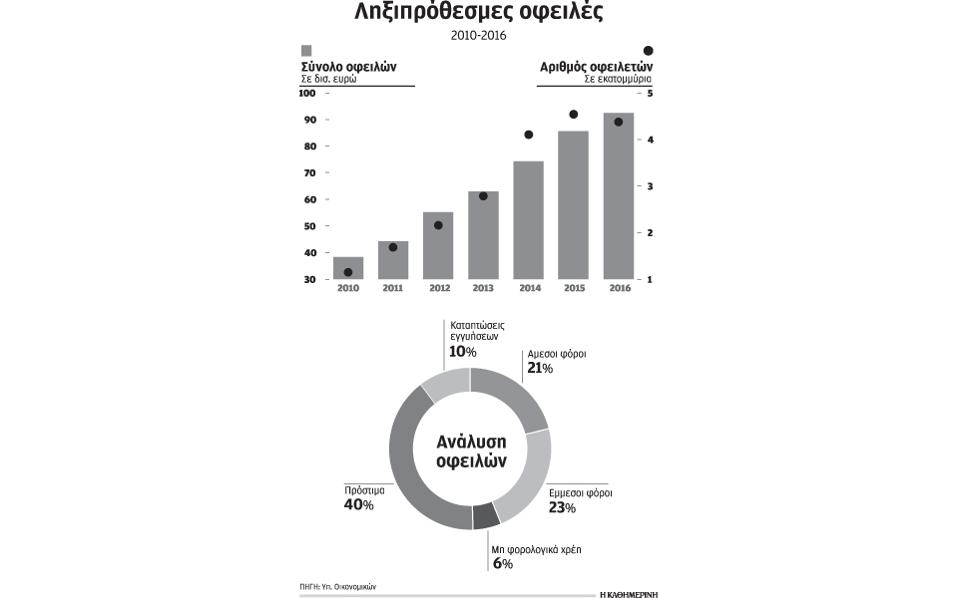 Σύμφωνα με τα στοιχεία, από περίπου τα 38 δισ. ευρώ που ανέρχονταν οι ληξιπρόθεσμες οφειλές στο Δημόσιο το 2010, έφθασαν στα 95 δισ. ευρώ στα τέλη του 2016. Οι δε οφειλέτες αυξήθηκαν σε 4,3 εκατ. από ένα εκατ. που ήταν το 2010.
