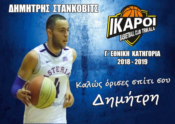 Ο Δημήτρης Στάνκοβιτς μετά τη διακοπή της συνεργασίας με την ομάδα του Αγρινίου (Β΄ Εθνική Κατηγορία), γύρισε για να συνεχίσει την καριέρα του στην ομάδα που αγωνίστηκε πέρυσι, τους Ικάρους Τρικάλων.