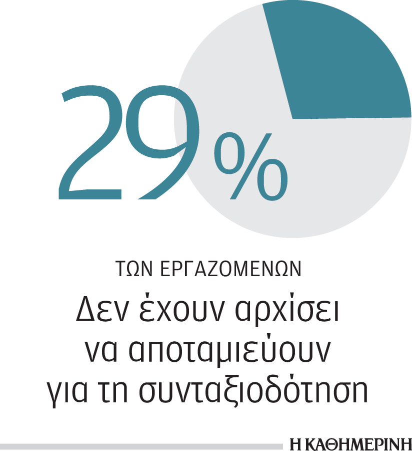 Πρόκειται για ένα από τα πιο χαμηλά ποσοστά παγκοσμίως και εξηγείται από τη γενικότερη τάση που επικρατεί και ρίχνει το βάρος στις καλύψεις ζωής και υγείας, που αποτελούν άλλωστε και άμεση προτεραιότητα για τους εργαζομένους. Οι εργαζόμενοι που συμμετέχουν στην έρευνα απαντούν σε ποσοστό 40% ότι δεν ξέρουν πώς να σχεδιάσουν τη συνταξιοδότησή τους, ενώ το 29% δεν έχει κάνει κάποια κίνηση για να αποταμιεύσει χρήματα. Υπεύθυνοι δεν είναι μόνον οι ίδιοι, όπως διαπιστώνει η έρευνα, αλλά και οι εργοδότες τους, οι οποίοι καλούνται από την πλευρά τους να αξιοποιήσουν το εργαλείο της ομαδικής ασφάλισης τόσο για καλύψεις υγείας όσο και για την παροχή σύνταξης, όχι μόνο για να ικανοποιήσουν μια πραγματική ανάγκη των εργαζομένων τους, αλλά και για να αυξήσουν την παραγωγικότητα του προσωπικού τους.