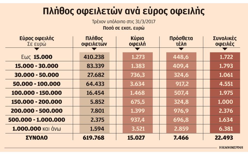 Να σημειωθεί ότι μέχρι το τέλος Μαρτίου, στο Κέντρο είχαν μεταφερθεί οφειλές ύψους 22,5 δισ. ευρώ, χωρίς ακόμη να έχει ολοκληρωθεί η μεταβίβαση του συνόλου των μικρών –έως 5.000 ευρώ– χρεών από τα ταμεία που ήδη έχουν ενταχθεί στον ΕΦΚΑ. Σήμερα, υπάρχουν 1.594 οφειλέτες με χρέη άνω του 1 εκατ. ευρώ, οι οποίοι συνολικά χρωστούν 6,38 δισ. ευρώ, ήτοι το 28% του συνόλου του χρέους που διαχειρίζεται το ΚΕΑΟ. Στον αντίποδα υπάρχουν άλλοι 410.238 οφειλέτες (66% του συνόλου των οφειλετών) που έχουν χρέη έως 15.000 ευρώ έκαστος, με τις συνολικές οφειλές τους να ανέρχονται σε 1,72 δισ. ευρώ.