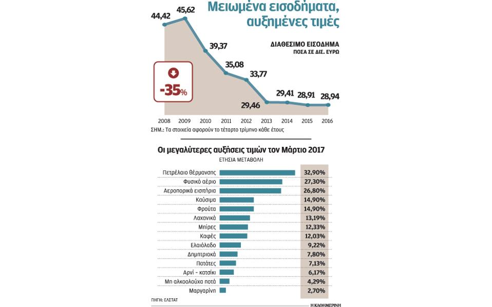 Κάτι παραπάνω από αισθητή είναι από τις αρχές του έτους η επίδραση της αύξησης των φόρων και η επιβολή νέων σε σειρά προϊόντων και υπηρεσιών. Οι τιμές έχουν πάρει την ανιούσα, σε σημείο που έπειτα από περίπου τέσσερα χρόνια αποπληθωρισμού, να εμφανιστεί πληθωρισμός σταθερά από τον Ιανουάριο έως και τον Μάρτιο. Οι πωλήσεις στο λιανεμπόριο τροφίμων υποχωρούν με ρυθμό που φτάνει ακόμη και το 15%. Η καταναλωτική εμπιστοσύνη βρίσκεται σε χαμηλότερα επίπεδα σε σύγκριση με το αντίστοιχο τρίμηνο τόσο του 2016 όσο και του 2015.