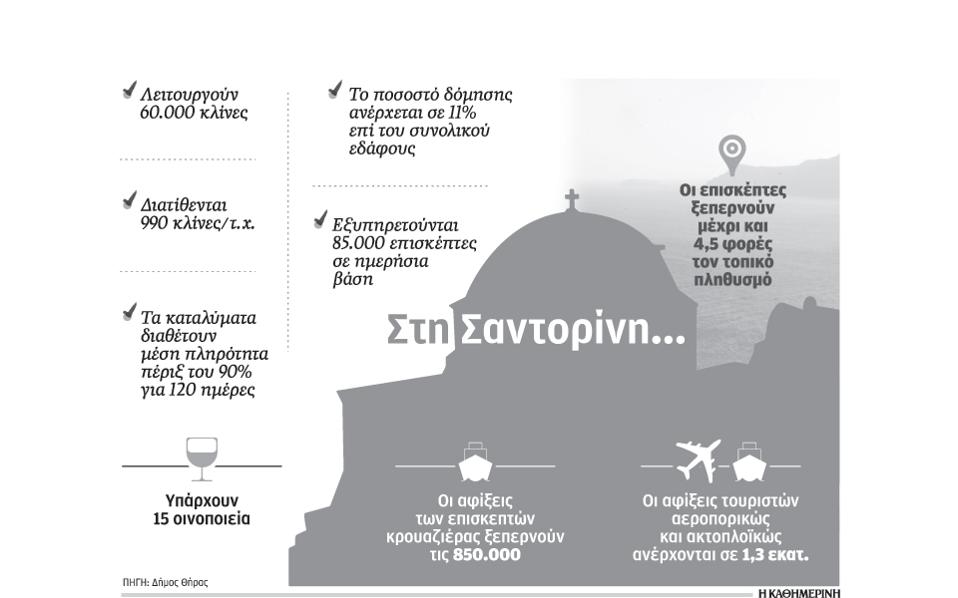 Ενδεικτικά αξίζει να αναφερθεί, βάσει των στοιχείων του δήμου, το υψηλό ποσοστό αναλογίας κλινών ανά τ.μ. (990 κλίνες ανά τ.χ.) και το υψηλό ποσοστό δόμησης (11% επί του συνολικού εδάφους) που συγκρίνεται μόνο με τα αντίστοιχα ποσοστά της Αττικής. Ο δήμαρχος Θήρας Νίκος Ζώρζος έχει στείλει από τον Νοέμβριο του 2015 επιστολές στο υπουργείο Τουρισμού ζητώντας την ανάληψη πρωτοβουλιών για τον χαρακτηρισμό της Σαντορίνης ως κορεσμένου τουριστικά προορισμο,ύ με βασικό στόχο τον περιορισμό της υπέρμετρης δόμησης των τουριστικών καταλυμάτων. Ωστόσο, μέχρι σήμερα δεν έχει λάβει σαφείς απαντήσεις.