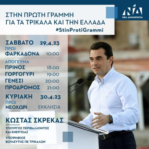 Ο Υπουργός Περιβάλλοντος και Ενέργειας και υποψήφιος βουλευτής Π.Ε. Τρικάλων, Κώστας Σκρέκας, το Σάββατο 29 Απριλίου και την Κυριακή 30 Απριλίου, θα επισκεφθεί τα ακόλουθα χωριά: