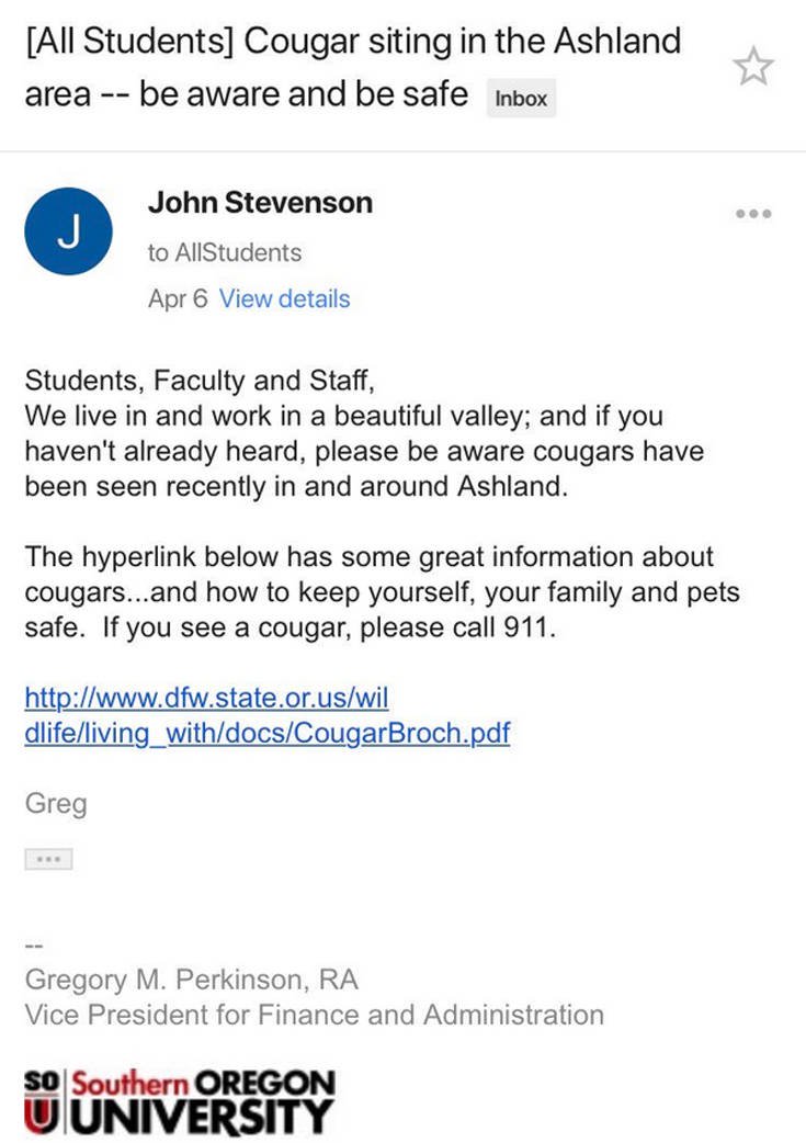 Αυτά έπαθε ο 23χρονος Caleb Diaz, φοιτητής του Southern Oregon University, όταν έλαβε κι αυτός το email του πανεπιστημίου που έλεγε στους πάντες να είναι προσεκτικοί για αυτή την εμφάνιση κούγκαρ στην περιοχή.