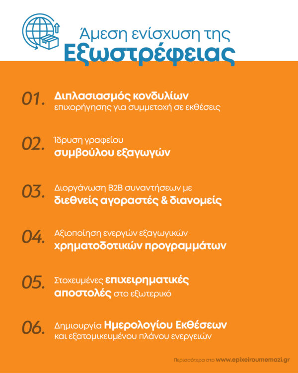 - Δημιουργία Ημερολογίου Εκθέσεων: Καθιέρωση ετήσιου πλάνου εκθέσεων όπου οι επιχειρήσεις θα μπορούν να βρίσκουν συγκεντρωμένες όλες τις σημαντικές εκθέσεις ανά κλάδο. Το πλάνο αυτό θα περιλαμβάνει και στοχευμένες προτάσεις για τις εκθέσεις που ταιριάζουν καλύτερα στις ανάγκες κάθε επιχείρησης, στοχεύοντας στη μέγιστη απόδοση της συμμετοχής τους.