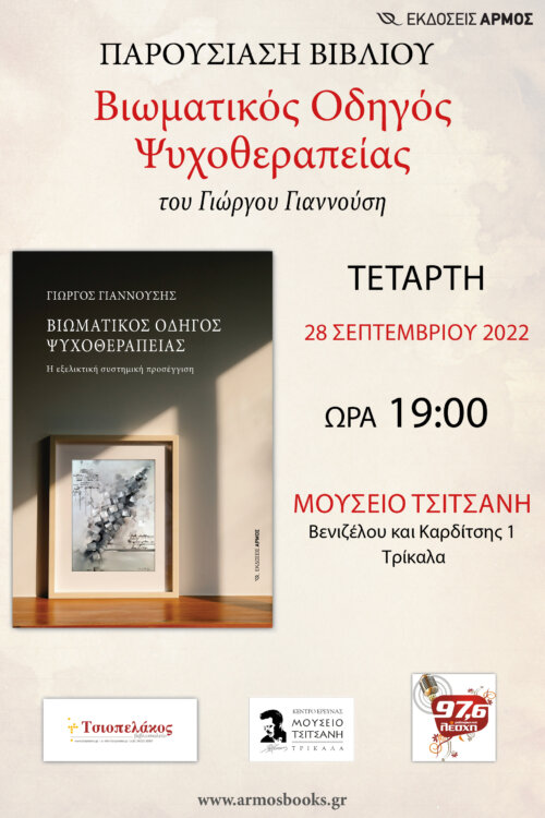 Το Βιβλιοπωλείο «Τσιοπελάκος» & οι Εκδόσεις Αρμός σας προσκαλούν στην παρουσίαση του βιβλίου του Γιώργου Γιαννούση “Βιωματικός Οδηγός Ψυχοθεραπείας. Η εξελικτική συστημική προσέγγιση” την Τετάρτη 28 Σεπτεμβρίου 2022 και ώρα 19:00 στο Μουσείο Τσιτσάνη