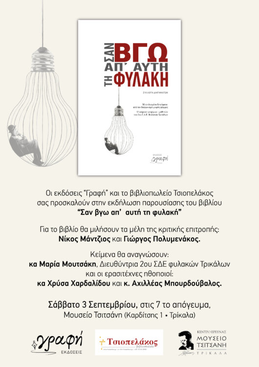 Οι εκδόσεις «Γραφή και το βιβλιοπωλείο Τσιοπελάκος σας προσκαλούν στην εκδήλωση παρουσίασης του βιβλίου «Σαν βγω απ’ αυτή τη φυλακή», το Σάββατο 3 Σεπτεμβρίου, ώρα 7 το απόγευμα, στην αίθουσα εκδηλώσεων του Μουσείου Τσιτσάνη.