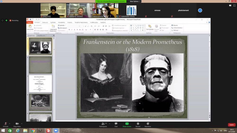 Την Τρίτη 8 Δεκεμβρίου πραγματοποιήθηκε διαδικτυακή εκδήλωση με θέμα την ιστορίατης συγγραφής και την διαχρονικότητα του κλασσικού αριστουργήματος της MaryShelley «Φρανκεστάιν». Εισηγήτρια της εκδήλωσης ήταν η κα Μαρία Σχοινά, Αναπληρώτρια Καθηγήτρια του τμήματος Αγγλικής Γλώσσας και Φιλολογίας του ΑΠΘ, με ειδικότητα στον Αγγλικό ρομαντισμό και την Γοτθική λογοτεχνία.