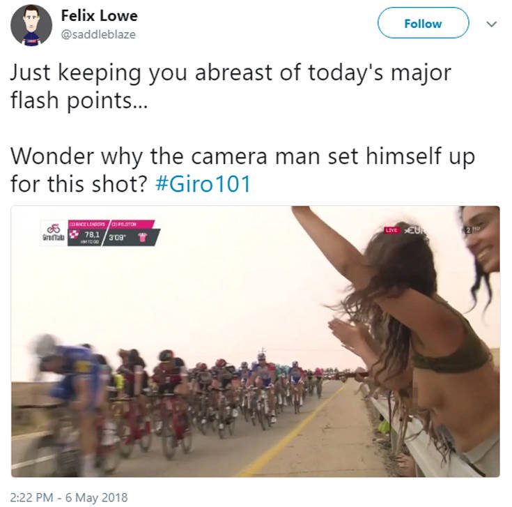 Έναν πρωτότυπο και σίγουρα ασυνήθιστο τρόπο βρήκε μια νεαρή γυναίκα για να ενθαρρύνει τους ποδηλάτες του Γύρου της Ιταλίας να συνεχίσουν την κούρσα τους.