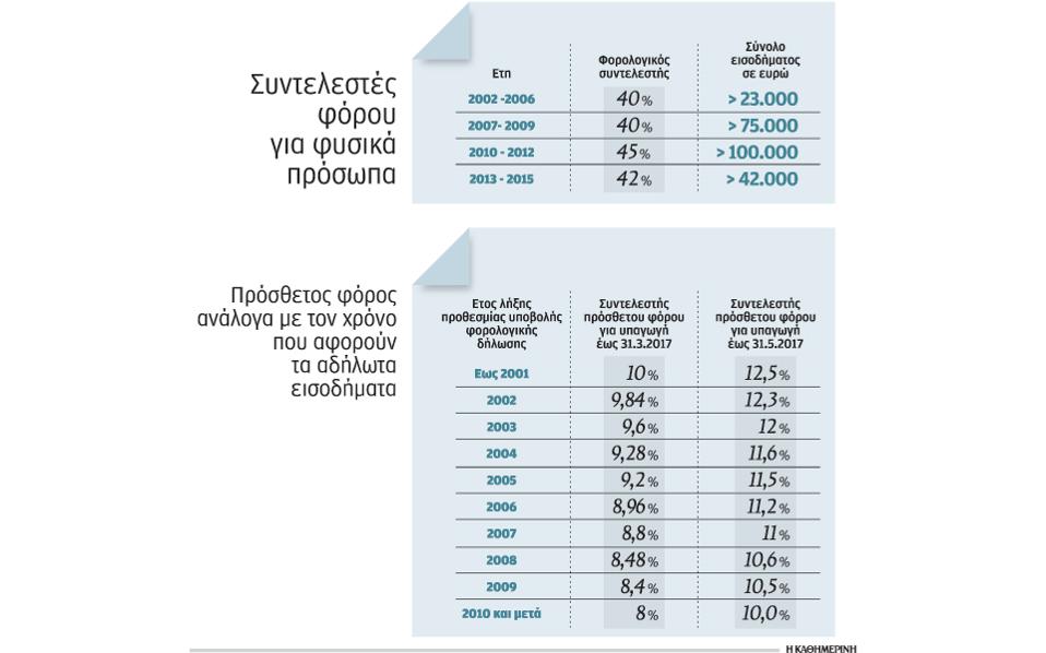 Για παράδειγμα, εισοδήματα που θα δηλωθούν οικειοθελώς και αφορούν αποκρυβέν εισόδημα των ετών 2002 – 2006 πάνω από 23.000 θα φορολογηθούν με 44%, αν η δήλωση υποβληθεί μέχρι 31.3.2017.