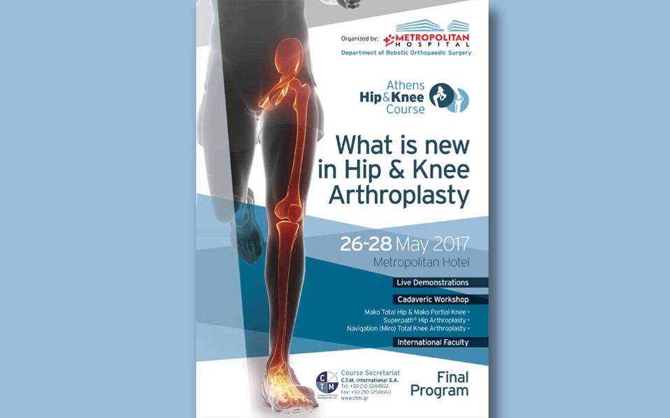 Οι νεότερες εξελίξεις στην Αρθροπλαστική Ισχίου και Γόνατος θα αναπτυχθούν στο Συνέδριο “What is new in Hip & Knee Arthroplasty” που θα πραγματοποιηθεί στην Αθήνα, από τις 26 έως και τις 28 Μαΐου 2017 στο Ξενοδοχείο Μetropolitan, με τη συμμετοχή διακεκριμένων ορθοπεδικών από την Ελλάδα και το εξωτερικό (Ευρώπη – Αμερική).