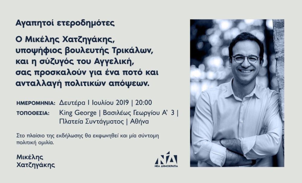 Με τους Τρικαλινούς ετεροδημότες που διαμένουν στην Αθήνα θα συναντηθεί και θα συζητήσει ο Μικέλης Χατζηγάκης την Δευτέρα 1 Ιουλίου 2019, στις 8.00 μ.μ., στο ξενοδοχείο King George στην πλατεία Συντάγματος.