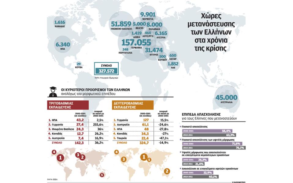 Επιπλέον, ο αριθμός των Ελλήνων τριτοβάθμιας εκπαίδευσης που μετανάστευσαν στη Γερμανία την τελευταία δεκαετία έχει αυξηθεί κατά 255,6% σε σύγκριση με την προηγούμενη δεκαετία, ενώ για τους Ελληνες δευτεροβάθμιας ή υποχρεωτικής εκπαίδευσης η αντίστοιχη αύξηση ήταν 15,5%. Συνολικά ο αριθμός των Ελλήνων τριτοβάθμιας εκπαίδευσης προς τις βασικές χώρες υποδοχής (ΗΠΑ, Γερμανία, Ηνωμένο Βασίλειο, Καναδάς, Αυστραλία) αυξήθηκε κατά 36,2%, ενώ την ίδια ώρα ο αριθμός των μεταναστών υποχρεωτικής εκπαίδευσης υποχώρησε κατά 14,9%.