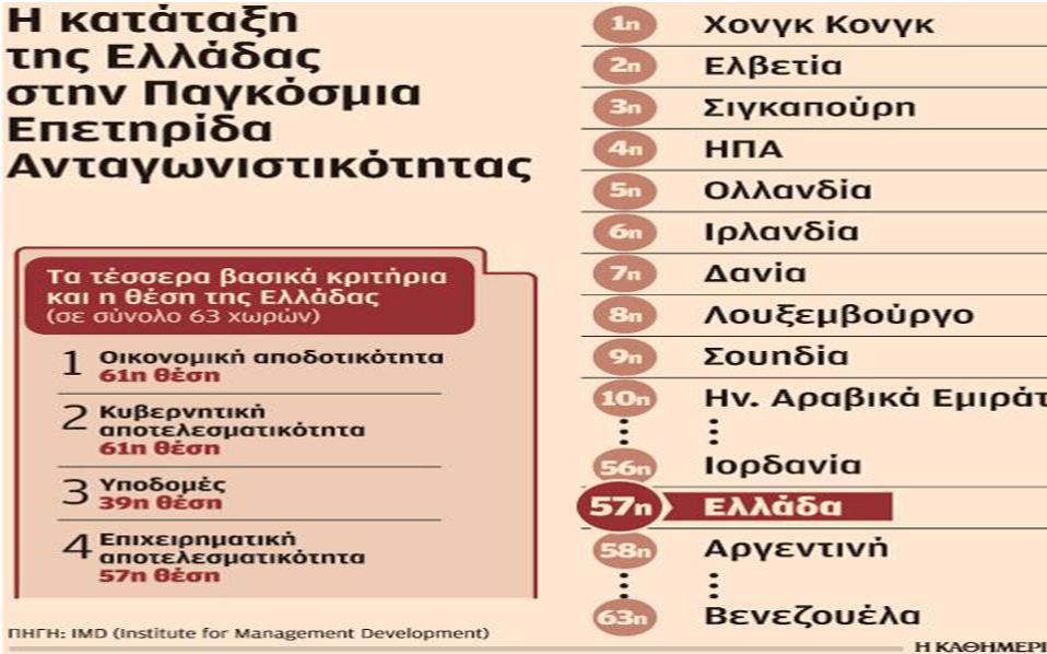 Κατά μία θέση υποχώρησε η Ελλάδα στην κατάταξη της Παγκόσμιας Επετηρίδας Ανταγωνιστικότητας το 2017, επιδεινώνοντας την ήδη πολύ χαμηλή θέση που κατείχε. Συγκεκριμένα, σύμφωνα με την έκθεση που καταρτίζει κάθε χρόνο το IMD (Institute for Management Development), η Ελλάδα κατατάσσεται φέτος στην 57η θέση μεταξύ 63 χωρών, από την 56η θέση πέρυσι. Μάλιστα, η Ελλάδα υποχωρεί ή παραμένει στάσιμη και στα τέσσερα κριτήρια που εξετάζει η έκθεση, ενώ είναι τρίτη από το τέλος ως προς την κυβερνητική αποτελεσματικότητα και την οικονομική αποδοτικότητα. Από τις χώρες της Ευρωπαϊκής Ενωσης που εξετάζονται στην έκθεση μόνο η Κροατία κατατάσσεται χαμηλότερα από την Ελλάδα.