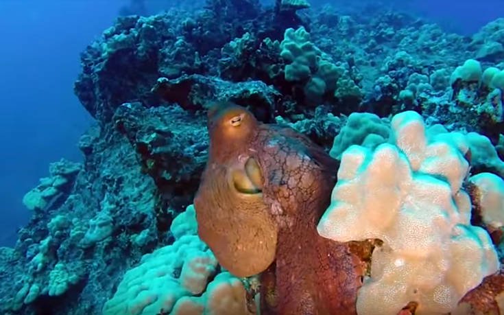 Την εντυπωσιακή αλλαγή του χρώματος ενός χταποδιού που προσπαθεί να προστατευτεί από επίθεση καταγράφει με την κάμερά του ένας δύτης.