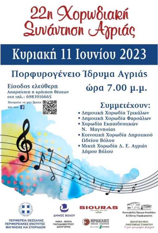 Η Δημοτική Χορωδία Τρικάλων και η Δημοτική Χορωδία δωματίου «Voci intonate» θα βρεθούν την Κυριακή το απόγευμα στην Αγριά Ν Μαγνησίας για να τραγουδήσουν στην 22η Χορωδιακή Συνάντηση. Η συναυλία θα δοθεί στο Πορφυρογένειο Ίδρυμα στις 19:00 και το πρόγραμμα που θα αποδώσουν οι δύο χορωδίες θα κινείται στο πλαίσιο του καλοκαιριού, με γνωστά τραγούδια Ελλήνων συνθετών.