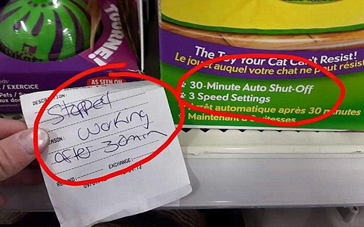 Εικόνες που δημοσιεύονται στα κοινωνικά δίκτυα αποκαλύπτουν κι άλλους λόγους όπως ενός πελάτη που επέστρεψε ένα λάδι για απολαυστικό μασάζ επειδή δεν το απόλαυσε ή ενός άλλου παιχνιδιού που έγραφε ότι σταματάει μόνο του ανά 30 λεπτά.