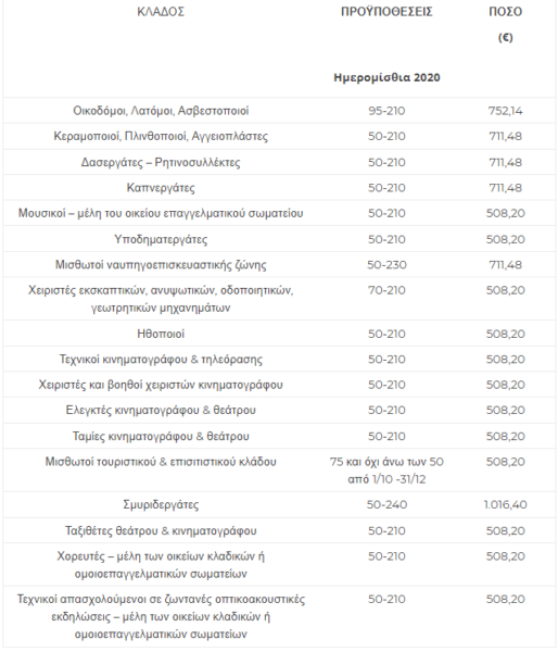 Οικοδόμου, λατόμου, ασβεστοποιού, κεραμοποιού, πλινθοποιού, αγγειοπλάστη, δασεργάτη, ρητινοσυλλέκτη, καπνεργάτη, μουσικού – μέλους οικείου επαγγελματικού σωματείου, υποδηματεργάτη, μισθωτού ναυπηγοεπισκευαστικής ζώνης, χειριστή εκσκαπτικών – ανυψωτικών – οδοποιητικών – γεωτρητικών μηχανημάτων, ηθοποιού, τεχνικού κινηματογράφου και τηλεόρασης χειριστή και βοηθού χειριστή κινηματογράφου, ελεγκτή κινηματογράφου και θεάτρου, ταμία κινηματογράφου και θεάτρου, μισθωτού τουριστικού και επισιτιστικού κλάδου, σμυριδεργάτη, ταξιθέτου θεάτρου – κινηματογράφου, χορευτή – μέλους οικείων κλαδικών ή ομοιοεπαγγελματικών σωματείων, καθώς και του τεχνικού απασχολούμενου σε ζωντανές οπτικοακουστικές εκδηλώσεις – μέλους των οικείων κλαδικών ή ομοιοεπαγγελματικών σωματείων.