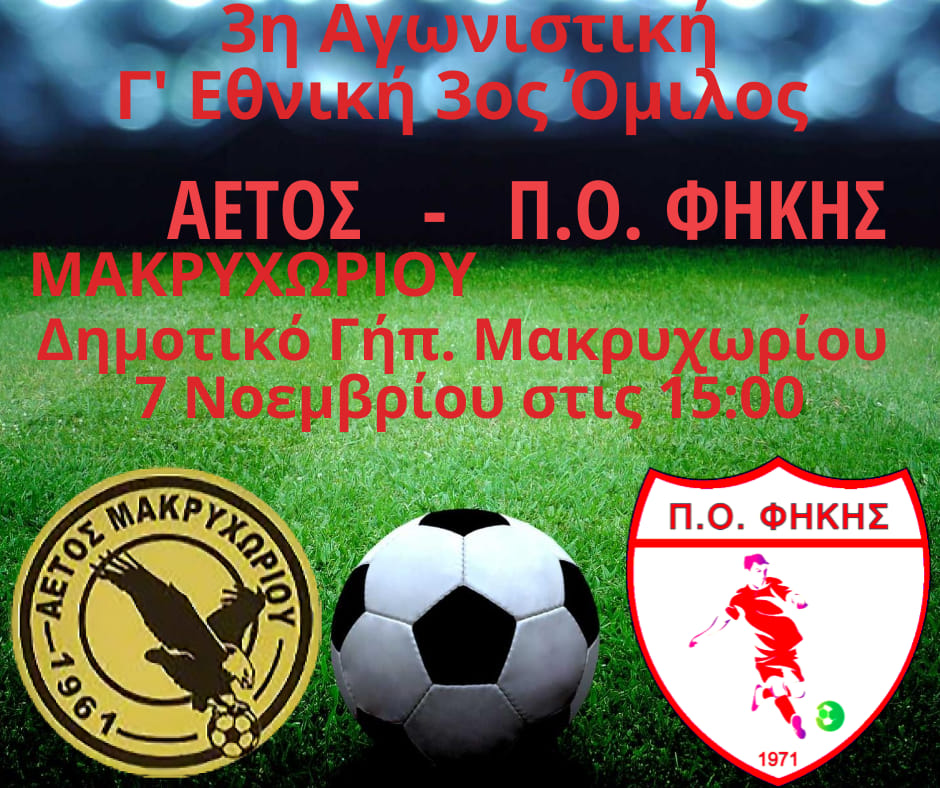 Στα πλαίσια της 3ης αγωνιστικής για την Γ’ Εθνική ο ΠΟ Φήκης θα αγωνιστεί στο Μακρυχώρι Λάρισας και θα βρεθεί αντιμέτωπος με την τοπική ομάδα του Αετού. Ο αγώνας θα γίνει την Κυριακή 7 Νοεμβρίου στις 15:00.