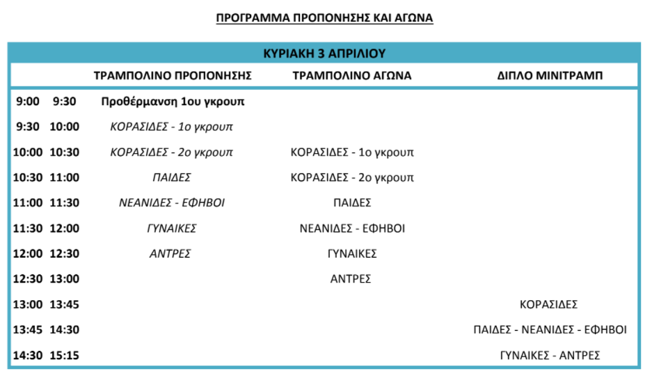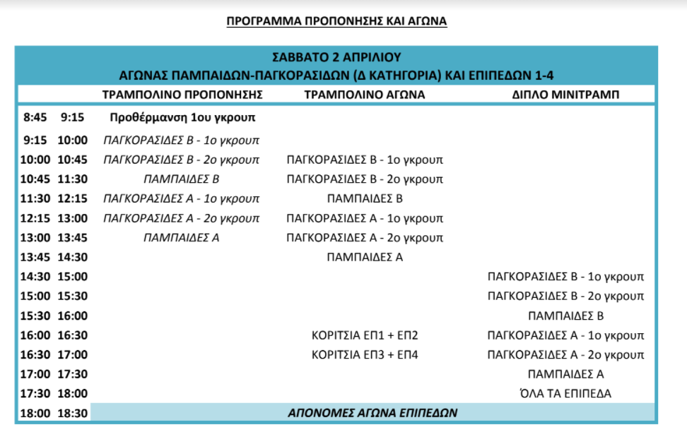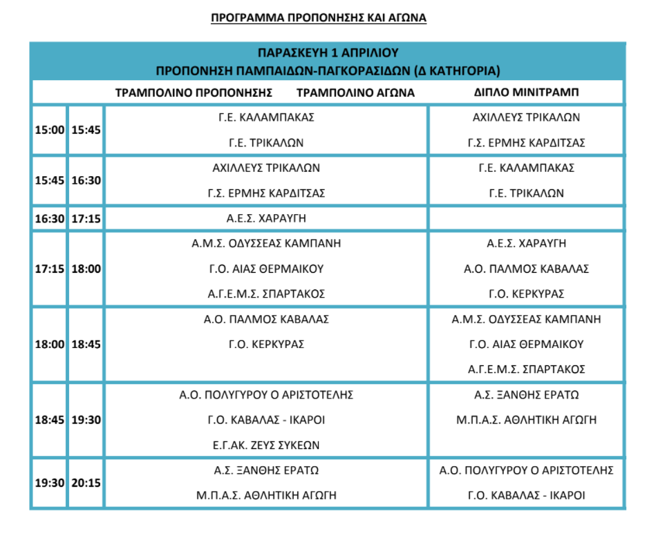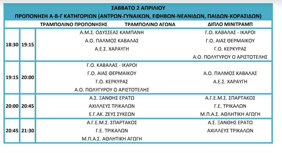 Από την Ελληνική Γυμναστική Ομοσπονδία ανακοινώνεται το πρόγραμμα των ΠΡΟΚΡΙΜΑΤΙΚΩΝ ΑΓΩΝΩΝ ΤΡΑΜΠΟΛΙΝΟ ΣΥΛΛΟΓΩΝ ΚΑΙ ΑΤΟΜΙΚΟΥ Α-Β-Γ-Δ ΚΑΤΗΓΟΡΙΩΝ ΚΑΙ ΠΕΡΙΦΕΡΕΙΑΚΟΥ ΑΓΩΝΑ ΤΡΑΜΠΟΛΙΝΟ ΕΠΙΠΕΔΩΝ 1-4 Β ΠΕΡΙΦΕΡΕΙΑΣ το οποίο θα διεξαχθεί στο κλειστό Βλαχάβειο Γυμναστήριο Καλαμπάκας το Σαββατοκύριακο 2-3 Απριλίου 2022.