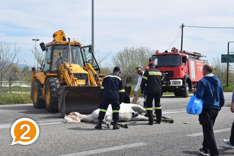 Ενα λευκό άλογο, για αδιευκρίνιστους λόγους, βρέθηκε στο οδόστρωμα και συγκρούστηκε διαδοχικά και μετωπικά με δύο διερχόμενα ΙΧ, προκαλώντας σοβαρές ζημιές στο οχήματα με αποτέλεσμα το θανάσιμο τραυματισμό του.