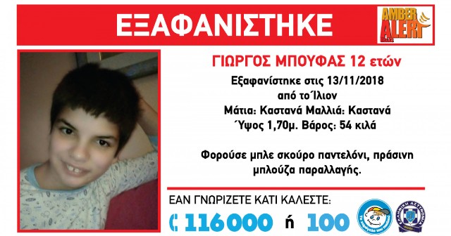 Στις 13/11/2018, στη 13:00, εξαφανίστηκε Γιώργος Μπούφας 12 ετών από την περιοχή του Ιλίου.