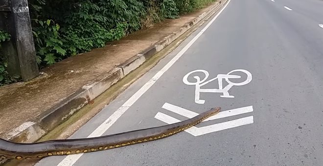Οι ίδιοι πάντως φάνηκαν να απολαμβάνουν το ασυνήθιστο θέαμα, με κάποιους να παροτρύνουν το γιγαντιαίο ερπετό να… σπεύσει στην αντίθετη πλευρά του δρόμου, προκειμένου να συνεχίσουν την πορεία τους