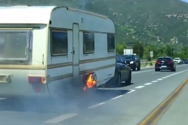 Διερχόμενος οδηγός που είδε το τροχόσπιτο με… αναμμένα τα λάστιχα κατέγραψε το περιστατικό και ανέβασε το βίντεο στo TikTok.