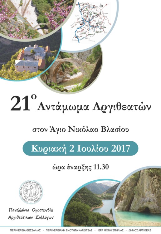 Στην τελική ευθεία βρίσκονται οι προετοιμασίες της Πανελλήνιας Ομοσπονδίας Αργιθεάτικων Συλλόγων (ΠΟΑΣ) για τη φετινή διοργάνωση του 21ου Ανταμώματος Αργιθεατών, το οποίο θα πραγματοποιηθεί την Κυριακή 2 Ιουλίου 2017, με ώρα έναρξης 11.30, στον Άγιο Νικόλαο Βλασίου. Στις 8.00 πμ θα προηγηθεί θεία λειτουργία χοροστατούντος του Σεβασμιότατου Μητροπολίτη Θεσσαλιώτιδος και Φαναριοφερσάλων, κ. Τιμόθεου, και αρτοκλασία.