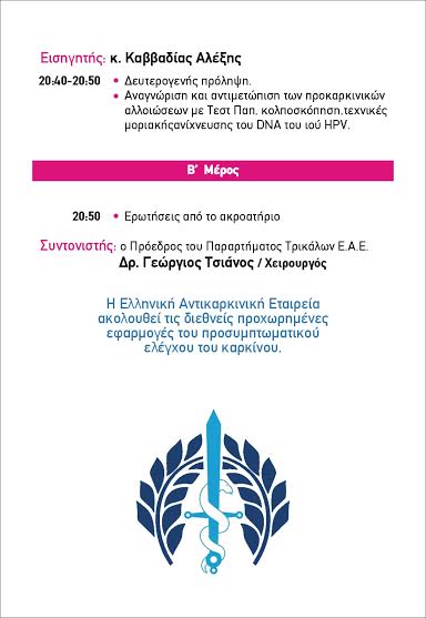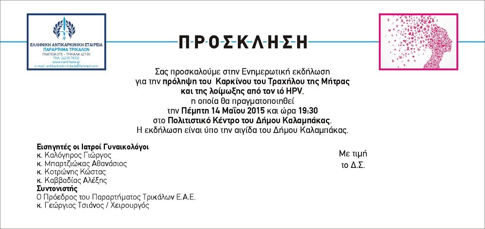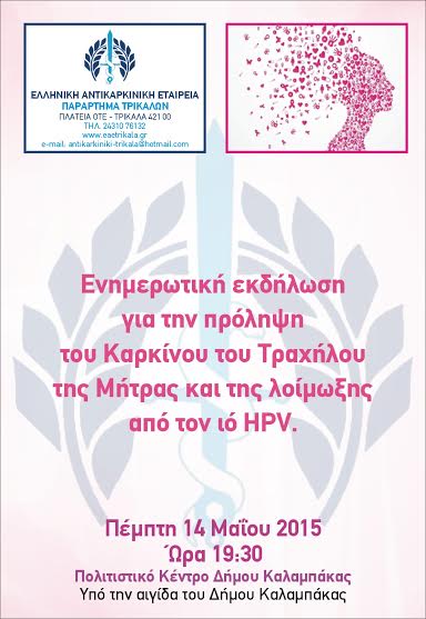 Τη Πέμπτη 14 Μαΐου 2015 και ώρα 19:30 στην αίθουσα του Πολιτιστικού Κέντρου του Δήμου Καλαμπάκας θα πραγματοποιηθεί ενημερωτική εκδήλωση για την πρόληψη του Καρκίνου του Τραχήλου της Μήτρας και της λοίμωξης από τον ιό HPV.