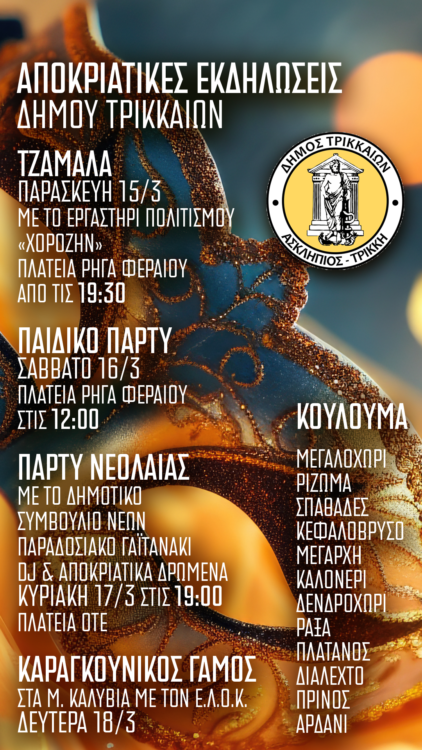 Εκδηλώσεις για τρικαλινούς/ες και επισκέπτες/τριες διοργανώνει το 2024 ο Δήμος Τρικκαίων. Το τριήμερο πριν τη Σαρακοστή και τη Καθαρά Δευτέρα, στην πόλη και τα χωριά, με τη συνεργασία Συλλόγων (Χοροζήν, ΕΛΟΚ, τοπικών συλλόγων και των Κοινοτήτων) και του Δημοτικού Συμβουλίου Νέων, προγραμματίστηκαν εκδηλώσεις για να γιορταστεί η Αποκριά. Οι εκδηλώσεις είναι: