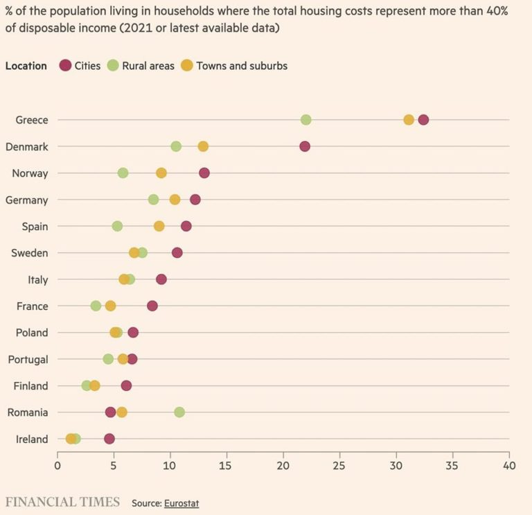 Σύμφωνα με την Eurostat, η Ελλάδα είναι μακράν η πρωταθλήτρια στις δαπάνες που αφορούν τη στέγαση: ενοίκιο, φορολογικά βάρη, δαπάνες για βασικές παροχές – ρεύμα, τηλεπικοινωνίες, ύδρευση και αποχέτευση. Συγκεκριμένα, πάνω από το 20% του πληθυσμού που ζει σε αγροτικές περιοχές, το 32% του πληθυσμού που ζει σε δευτερεύουσες πόλεις και το 35% που ζει σε μεγάλα αστικά κέντρα, δαπανά πάνω από το 40% του διαθέσιμου εισοδήματός του για καλυφθούν αυτά τα βασικά κόστη! Οι δε συγκρίσεις είναι συντριπτικές, καθώς στην δεύτερη Δανία, το 5%, 9% και 22% του πληθυσμού που ζει αντίστοιχα σε αγροτικές περιοχές, δευτερεύουσες πόλεις και αστικά κέντρα, δαπανά πάνω από 40% για την κάλυψη τους κόστους στέγασης. Το συμπέρασμα; Ως προς το εισόδημα του πληθυσμού, έχουμε τα πιο ακριβά ενοίκια, ρεύμα, φορολογικά βάρη, τηλεπικοινωνίες