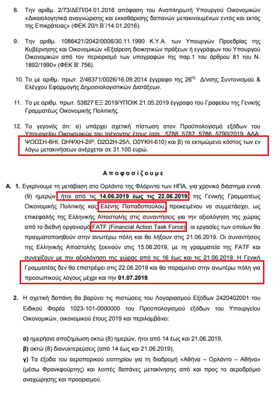 Η Έλενα Παπαδοπούλου, κόρη του βουλευτή του ΣΥΡΙΖΑ Σκάκη Παπαδόπουλου και στενή συνεργάτιδα του Ευκλείδη Τσακαλώτου, μαζί με πολυπληθή αποστολή θα μεταβεί στο Ορλάντο στις 14 Ιουνίου, όπως γράφει ο «Βηματοδότης» προκειμένου να συμμετάσχει ως επικεφαλής της ελληνικής αποστολής στις ειδικές συναντήσεις για την αξιολόγηση της χώρας μας από τον διεθνή οργανισμό που ελέγχει την εφαρμογή των κανόνων για το ξέπλυμα χρήματος (Financial Action Task Force).