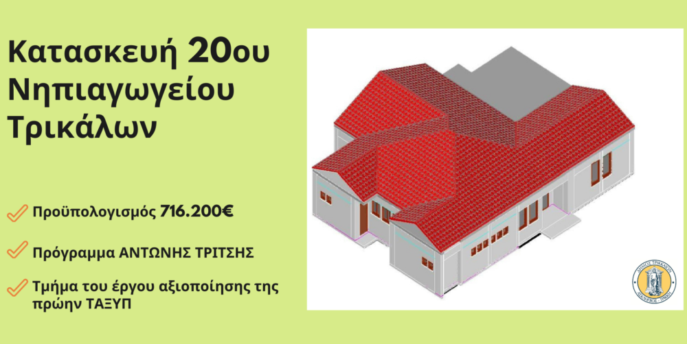 Με προϋπολογισμό 716.200,00€ το έργο θα υποβληθεί στο συγκεκριμένο πρόγραμμα, καθώς ήδη η Τεχνική Υπηρεσία του Δήμου Τρικκαίων ολοκλήρωσε τη σχετική μελέτη. ΤΟ σχολείο λύνει ένα χρόνιο πρόβλημα με τη στέγαση νηπιαγωγείου στην περιοχή (μέχρι τώρα μισθώνεται κτήριο). Επίσης, θα είναι και ενεργειακά σύμφωνο με τη βιώσιμη ανάπτυξη, καθώς στη στέγη του θα τοποθετηθούν φωτοβολταϊκά στοιχεία.