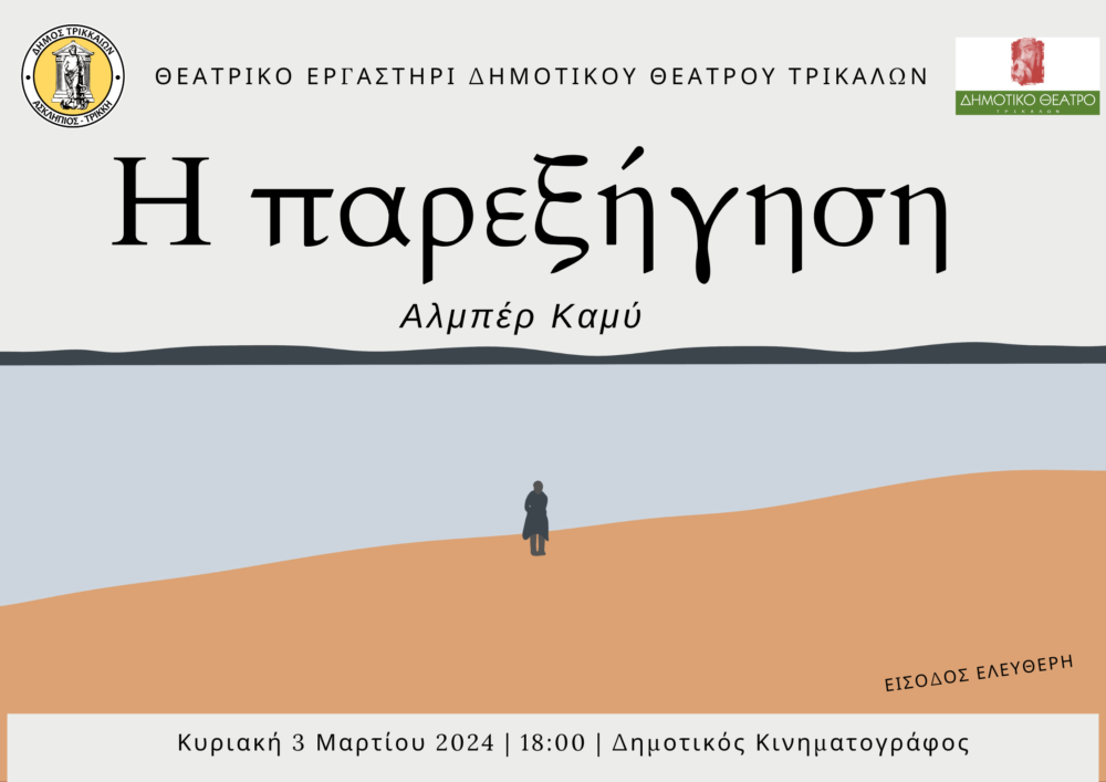 Με Αλμπέρ Καμύ συνεχίζονται οι παραστάσεις του Θεατρικού Εργαστηρίου (εφηβικό τμήμα) του Δημοτικού Θεάτρου Τρικάλων. Την Κυριακή 3 Μαρτίου 2024 στις 6.00 μ.μ. στον Δημοτικό Κινηματογράφο του Μύλου Ματσόπουλου θα παρουσιαστεί η θεατρική παράσταση «Η παρεξήγηση» του κορυφαίου Γάλλου νομπελίστα και φιλοσόφου Αλμπέρ Καμύ.