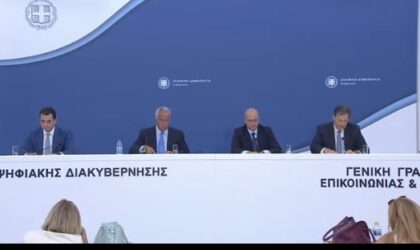 Κώστας Σκρέκας, Μάκης Βορίδης και Θόδωρος Σκυλακάκης, με τον κυβερνητικό εκπρόσωπο Γιάννη Οικονόμου να συντονίζει τη συνέντευξη Τύπου, παρουσιάζουν το...