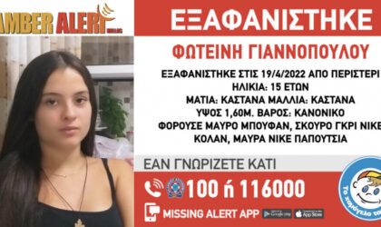 Συναγερμός έχει σημάνει στις αστυνομικές αρχές από την εξαφάνιση της 15χρονης Φωτεινής Γιαννοπούλου από το Περιστέρι. Η 15χρονη εξαφανίστηκε στις 19.04.2022...