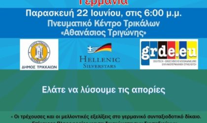 Ο Δήμος Τρικκαίων σε συνεργασία με την Ελληνογερμανική Συνέλευση και τους «Hellenic Silverstars» – (Επαναπατριζόμενοι από τη Γερμανία) διοργανώνουν ενημερωτική...