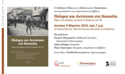 Οι εκδόσεις Τόπος και το βιβλιοπωλείο Τσιοπελάκος διοργανώνουν την παρουσίαση του νέου βιβλίου “Πόλεμος Και Αντίσταση Στη Θεσσαλία” τη Δευτέρα...