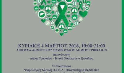 Εκδήλωση ευαισθητοποίησης για τη δωρεά οργάνων Επιστημονική εκδήλωση με στόχο την ευαισθητοποίηση για τη δωρεά οργάνων, συνδιοργανώνουν ο Δήμος Τρικκαίων...