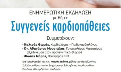 Ενημερωτική εκδήλωση με θέμα τις «Συγγενείς καρδιοπάθειες» πραγματοποιείται την Τετάρτη 14 Φεβρουαρίου στα Τρίκαλα. Πρόκειται για διοργάνωση του Δήμου Τρικκαίων...