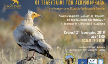 Η Ελληνική Ορνιθολογική Εταιρεία, σε συνεργασία με τον Δήμο Καλαμπάκας, σας προκαλεί την Κυριακή, 21 Ιανουαρίου 2018 στην πρώτη προβολή...