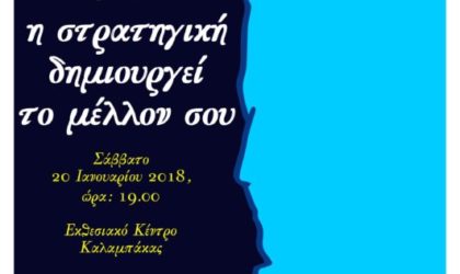 Το Σάββατο 20 Ιανουαρίου 2018 και ώρα 19:00, στο Πολιτιστικό Κέντρο Καλαμπάκας, θα πραγματοποιηθεί διάλεξη με θέμα τον επαγγελματικό προσανατολισμό...
