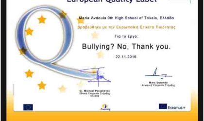 Για δεύτερη συνεχή χρονιά το 9ο Γυμνάσιο Τρικάλων βραβεύεται με την Ευρωπαϊκή Ετικέτα Ποιότητας η οποία είναι ένα δεύτερο αναγνωριστικό της επιτυχίας ενός eTwinning έργου....