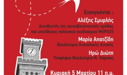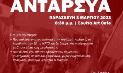 Η Τοπική Επιτροπή Τρικάλων της ΑΝΤ.ΑΡ.ΣΥ.Α. διοργανώνει την Παρασκευή 3 Μάρτη στις 8:30 μ.μ., στη Σουίτα Art Cafe (Στρατηγού Σαράφη 18) εκδήλωση – συζήτηση παρουσιάζοντας την πολιτική...