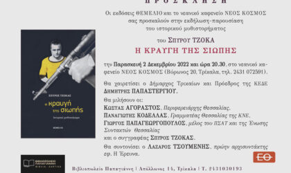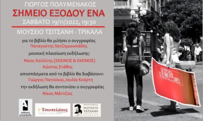 Το βιβλιοπωλείο Τσιοπελάκος και οι εκδόσεις Απόπειρα, σας προσκαλούν στην παρουσίαση του βιβλίου του Γιώργου Πολυμενάκου με τίτλο: “Σημείο Εξόδου Ένα“, το Σάββατο 19/11 ώρα 19:30, στην αίθουσα εκδηλώσεων του Μουσείου Τσιτσάνη. Για το βιβλίο θα μιλήσει ο Παναγιώτης Χατζημωυσιάδης, συγγραφέας. Μουσική πλαισίωση εκδήλωσης: Νίκος Καλλίνης (ΕΚΕΙΝΟΣ ΚΙ ΕΚΕΙΝΟΣ) και Κώστας Στάθης. Αποσπάσματα από το βιβλίο θα διαβάσουν οι Γιώργος Πατούκας, Ιουλία Κούρτη....