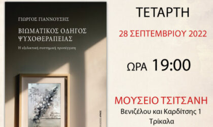 Το Βιβλιοπωλείο «Τσιοπελάκος» & οι Εκδόσεις Αρμός σας προσκαλούν στην παρουσίαση του βιβλίου του Γιώργου Γιαννούση “Βιωματικός Οδηγός Ψυχοθεραπείας. Η...